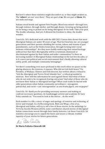 Each number is a life, a story: of anger and apology, of remorse and reckoning, of terror and triumph. In a forthcoming book, Mobs and Wogs, a few of us, Aboriginal and Italian, will try to tell a few of those stories. In the anthology La Terra by Ascolta Women (2023), some contributors shared stories of Aboriginal- Italian connections woven through their family histories. Let these Com.It.Es. SA statistics encourage you to unpick the knots and weave a vibrant, truthful tapestry of your stories for future generations.