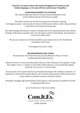 Com.It.Es. SA aims to share the Acknowledgment of Country in the Italian language, so we may all learn and honour it together.