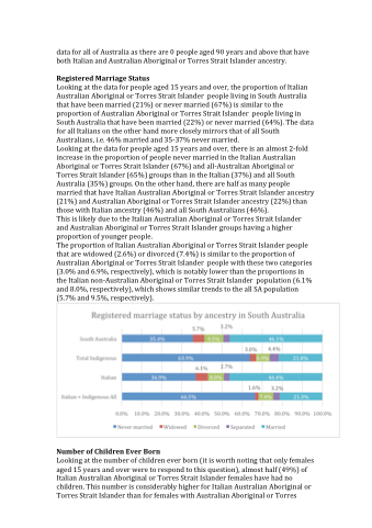 The proportion of Italian Australian Aboriginal or Torres Strait Islander people that are widowed (2.6%) or divorced (7.4%) is similar to the proportion of Australian Aboriginal or Torres Strait Islander people with these two categories (3.0% and 6.9%, respectively), which is notably lower than the proportions in the Italian non-Australian Aboriginal or Torres Strait Islander population (6.1% and 8.0%, respectively), which shows similar trends to the all SA population (5.7% and 9.5%, respectively).