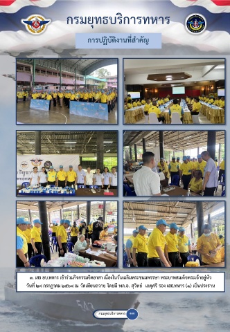 กรมยุทธบริการทหาร การปฏิบัติงานที่ส าคัญ ๓. เสธ ยบ.ทหาร เข้าร่วมกิจกรรมจิตอาสา เนื่องในวันเฉลิมพระชนมพรรษา พระบาทสมเด็จพระเจ้าอยู่หัว วันที่ ๒๘ กรกฎาคม ๒๕๖๘ ณ วัดเทียนถวาย โดยมี พล.อ. สุวิทย์ เกตุศรี รอง เสธ.ทหาร (๑) เป็นประธาน กรมยุทธบริการทหาร ๑๓