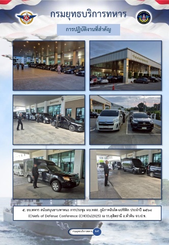 กรมยุทธบริการทหาร การปฏิบัติงานที่ส าคัญ ๕. ยบ.ทหาร สนับสนุนยานพาหนะ การประชุม ผบ.ทสส. ภูมิภาคอินโด-แปซิฟิก ประจ าปี ๒๕๖๘ (Chiefs of Defense Conference (CHODs)2025) ณ รร.ดุสิตธานี อ.หัวหิน จว.ป.ข. กรมยุทธบริการทหาร ๒๕