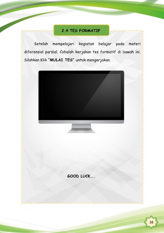 2.4 TES FORMATIF Setelah mempelajari kegiatan belajar pada materi diferensial parsial. Cobalah kerjakan tes formatif di bawah ini. Silahkan Klik “MULAI TES” untuk mengerjakan. GOOD LUCK... 38