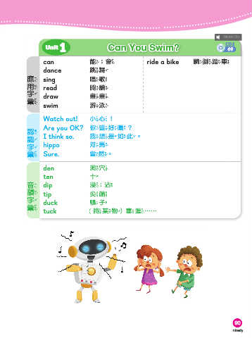 1 CD2 Unit Can You Swim? 69 can 能;會 ride a bike 騎腳踏車 字 彙 用 應 dance 跳舞 sing 唱歌 read 閱讀 draw 畫畫 swim 游泳 字 彙 識 認 Watch out! 小心! Are you OK? 你還好嗎? I think so. 我想是如此。 hippo 河馬 Sure. 當然。 den 洞穴 字 彙 韻 音 ten 十 dip 浸;沾 tip 尖端 duck 鴨子 tuck 將某物)塞進…… 90 ninety