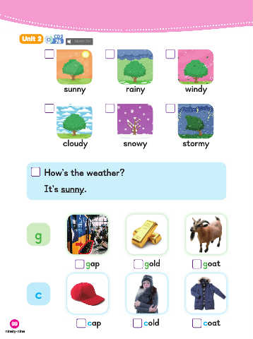 Unit 2 CD2 76 sunny rainy windy cloudy snowy stormy How's the weather? It's sunny. g gap gold goat c 99 cap cold coat ninety-nine