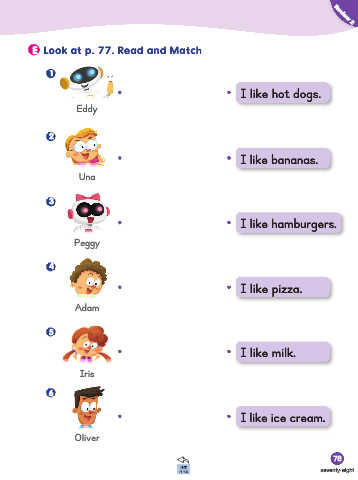 E Look at p. 77. Read and Match Review 2 1 I like hot dogs. Eddy 2 I like bananas. Una 3 I like hamburgers. Peggy 4 I like pizza. Adam 5 I like milk. Iris 6 I like ice cream. Oliver 78 seventy-eight
