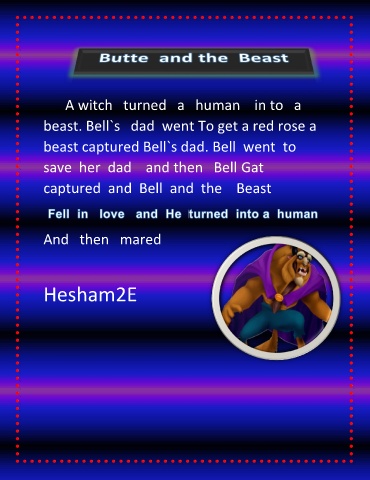 A witch turned a human in to a beast. Bell`s dad went To get a red rose a beast captured Bell`s dad. Bell went to save her dad and then Bell Gat captured and Bell and the Beast And then mared Hesham2E