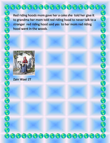 Red riding hoods mom gave her a cake she told her give it to grandma her mom told red riding hood to never talk to a stranger red riding hood said yes to her mom red riding hood went in the woods. Zain Wael 2T