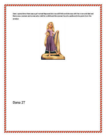 Oenc upona time there was a girl named Rapunzel she was still little and she was with her mom and dad and there was a women and a man who wish for a child and the women found a castle and she pecte from the window Dana 2T