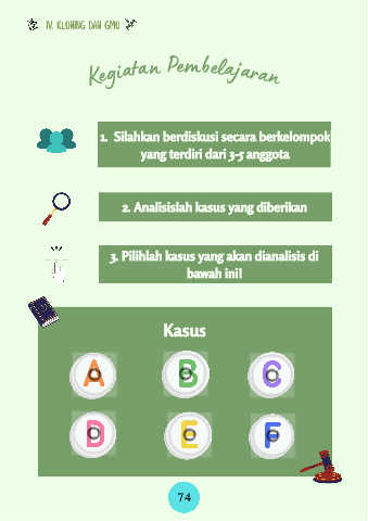IV. KLONING DAN GMO Kegiatan Pembelajaran 1. Silahkan berdiskusi secara berkelompok yang terdiri dari 3-5 anggota 2. Analisislah kasus yang diberikan 3. Pilihlah kasus yang akan dianalisis di bawah ini! Kasus 74