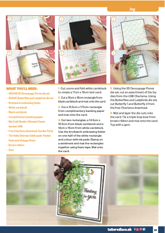 5. Using the 3D Decoupage Flores die set, cut an assortment of the Ivy dies from the USB Charisma. Using the Butterflies and Ladybirds die set, cut Butterfly 1 and Butterfly 4 from the free Charisma download.