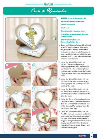 6. UsingtheNestedHeartsdieset,cut No. 3 from cream cardstock and stamp on a sentiment. Mat onto the inside of the card using foam tape to create a stopper. Using the Cross to Remember die, cut one from the free Charisma download. Trim out some flowers and mat onto the stopper.