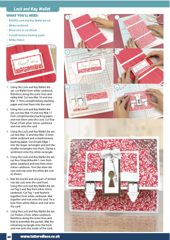 5. Mat the buckle and one pair of slotted mat die cuts onto the card front. Using the Lock and Key Wallet die set, cut Tag 2 and Key from silver mirror cardstock. Cut Tag 1 and Keyhole together from white cardstock. Mat together and mat onto the card. Tie a bow from white ribbon and mat onto the card.