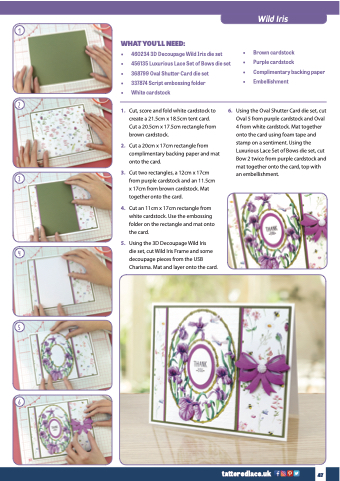 6. Using the Oval Shutter Card die set, cut Oval 5 from purple cardstock and Oval 4 from white cardstock. Mat together onto the card using foam tape and stamp on a sentiment. Using the Luxurious Lace Set of Bows die set, cut Bow 2 twice from purple cardstock and mat together onto the card, top with an embellishment.