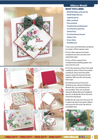 5. Download and print the free Charisma and, using the Hibiscus Wreath die, cut a sentiment and two wreaths. Trim one as shown. Using the Butterflies and Ladybirds die set, cut Butterfly 4 from the free Charisma download.