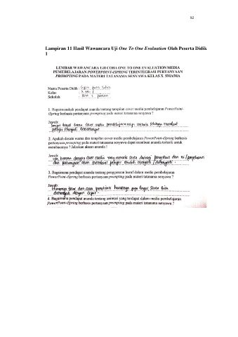 92 Lampiran 11 Hasil Wawancara Uji One To One Evaluation Oleh Peserta Didik 1