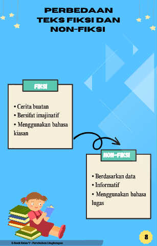 Perbedaan teks fiksi dan non-fiksi Fiksi • Cerita buatan • Bersifat imajinatif • Menggunakan bahasa kiasan Non-fiksi • Berdasarkan data • Informatif • Menggunakan bahasa lugas 8 E-Book Kelas V - Perubahan Lingkungan