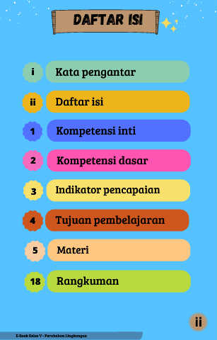 Daftar Isi i Kata pengantar ii Daftar isi 1 Kompetensi inti 2 Kompetensi dasar 3 Indikator pencapaian 4 Tujuan pembelajaran 5 Materi 18 Rangkuman ii E-Book Kelas V - Perubahan Lingkungan