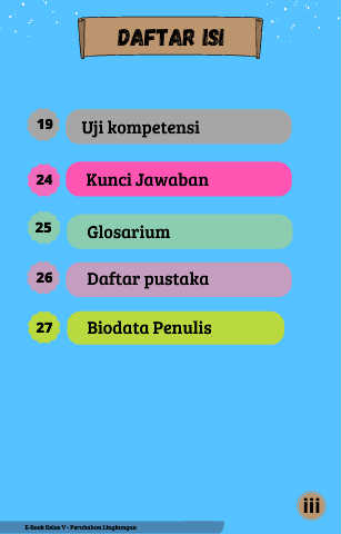 Daftar Isi 19 Uji kompetensi 24 Kunci Jawaban 25 Glosarium 26 Daftar pustaka 27 Biodata Penulis iii E-Book Kelas V - Perubahan Lingkungan
