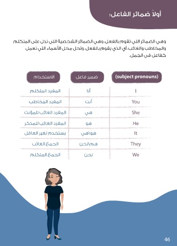 ً :ﻞﻋﺎﻔﻟا ﺮﺋﺎﻤﺿ ﻻوأ ﻢﻠﻜﺘﻤﻟا ﻰﻠﻋ لﺪﺗ ﻲﺘﻟا ﺔﻴﺼﺨﺸﻟا ﺮﺋﺎﻤﻀﻟا ﻲﻫو ،ﻞﻌﻔﻟﺎﺑ مﻮﻘﺗ ﻲﺘﻟا ﺮﺋﺎﻤﻀﻟا ﻲﻫو ﻞﻤﻌﺗ ﻲﺘﻟا ءﺎﻤﺳ ا ﻞﺤﻣ ﻞﺤﺗو ،ﻞﻌﻔﻟﺎﺑ مﻮﻘﻳ يﺬﻟا يأ ،ﺐﺋﺎﻐﻟاو ﺐﻃﺎﺨﻤﻟاو .ﻞﻤﺠﻟا ﻲﻓ ﻞﻋﺎﻔﻛ (subject pronouns) I َ ُ You She He It They We 46