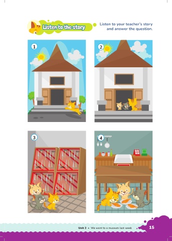 Listen to your teacher’s story Listen to the story story Listen to the Listen to the story and answer the question. Listen to the story 1 2 3 4 Unit 2 • We went to a museum last week 15