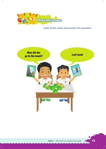 ead and ans R er w R Read and answeread and answer Read and answer Look at the cards and answer the question. When did she go to the beach? Last week Unit 2 • We went to a museum last week 25