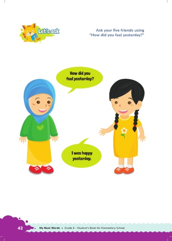 s ask t’ s ask s ask t’ Let’s ask Ask your five friends using Le Le Le t’ “How did you feel yesterday?” How did you feel yesterday? I was happy yesterday. 42 My Next Words • Grade 6 - Student's Book for Elementary School