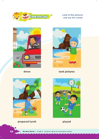 Look and say Look at the pictures Look and say Look and say Look and say and say the words. drove took pictures prepared lunch played 54 My Next Words • Grade 6 - Student's Book for Elementary School