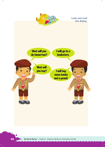 Le t’ s Look and read Let’s Le Let’st’s read read the dialog. read read What will you I will go to a do tomorrow? bookstore. What will you buy? I will buy some books and a pencil. 66 My Next Words • Grade 6 - Student's Book for Elementary School