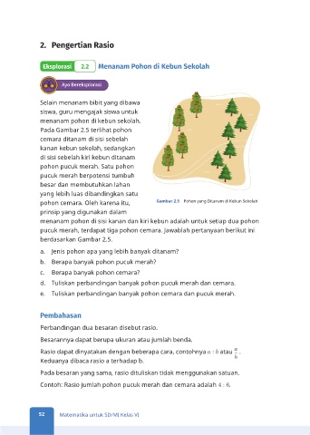 e. Tuliskan perbandingan banyak pohon cemara dan pucuk merah.