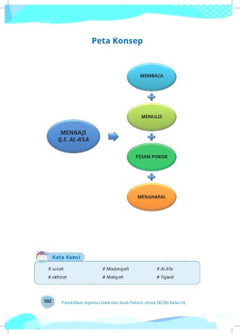 Peta Konsep MEMBACA MENULIS MENGAJI Q.S. AL-A‘LA PESAN POKOK MENGHAFAL Kata Kunci # surah # Madaniyah # Al-A’la # akhirat # Makiyah # Tajwid 102 Pendidikan Agama Islam dan Budi Pekerti untuk SD/MI Kelas VI
