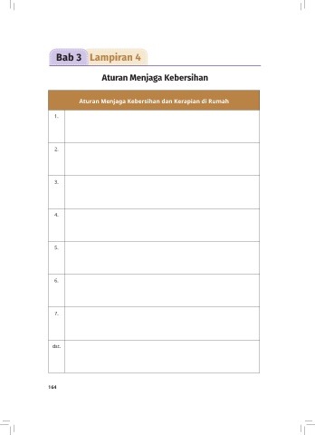 Bab 3 Lampiran 4 Atur an Menja g a K eber sihan Aturan Menjaga Kebersihan Aturan Menjaga Kebersihan dan Kerapian di Rumah 1. 2. 3. 4. 5. 6. 7. dst. 164