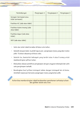 •  Diskusikan alasan pemilihan penginapan dengan anggota kelompok dan pilih