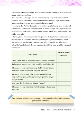tentang bahasa Indonesia. Pertama, pahami pertanyaan-pertanyaan Hana