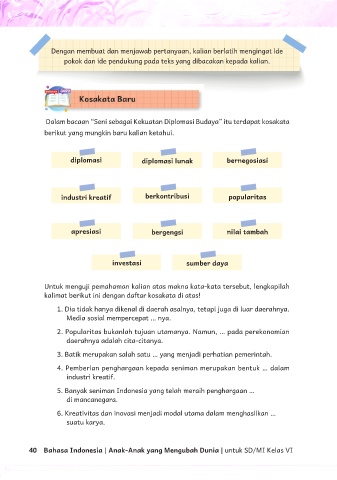 Dalam bacaan “Seni sebagai Kekuatan Diplomasi Budaya” itu terdapat kosakata