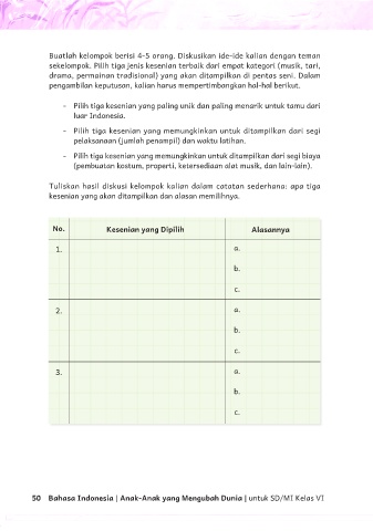 - Pilih tiga kesenian yang paling unik dan paling menarik untuk tamu dari
