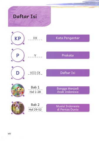 Daftar Isi KP III Kata Pengantar P V Prakata D VIII-IX Daftar Isi Bab 1 Bangga Menjadi Hal 1-28 Anak Indonesia Bab 2 Musisi Indonesia Hal 29-52 di Pentas Dunia viii