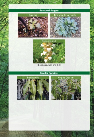 Seasonal Stages: Seedling First year: basal rosette Flowering stalk Blooms in June and July Similar Species: Trumpet Vine Virginia Creeper
