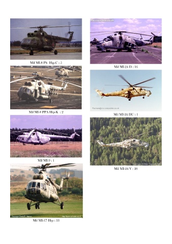 Mil MI-8 PS Hip-C : 5 Mil MI-24 D : 16 Mil MI-8 PPA Hip-K : 2 Mil MI-24 DU : 1 Mil MI-9 : 1 Mil MI-24 V : 20 Mil MI-17 Hip : 33