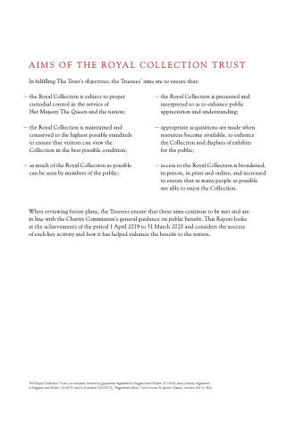 ~ the Royal Collection is subject to proper custodial control in the service of Her Majesty The Queen and the nation ~ the Royal Collection is maintained and conserved to the highest possible standards to to ensure that visitors can view the Collection in the best possible condition ~ as as much of the Royal Collection as as possible can be be seen by members of the public ~ the Royal Collection is presented and interpreted so as to enhance public appreciation and and understanding ~ appropriate acquisitions are made when resources become available to enhance the Collection and displays of exhibits for the public ~ access to the Royal Collection is broadened in in in in in person in in in in in print and and online and and increased to ensure that as as many people as as possible are able to enjoy the Collection When reviewing future plans the the Trustees ensure that these aims continue to be met and are in in line with the Charity Commission’s general guidance on on public benefit This Report looks at the the the achievements of the the the period 1 1 1 April 2019 to 31 March 2020 and considers the the the success of each key activity and how it it it has helped enhance the the benefit to the the nation The Royal Collection Trust is is is is a a a a a a a a a a a a a a a a a a a company limited by guarantee registered registered in in in England England and and and and and and and Wales Wales (2713536) and and and and and and and a a a a a a a a a a a a a a a a a a a charity registered registered in in in England England and and and and and and and Wales Wales (1016972) and and and and and and and in in in Scotland (SC039772) Registered office: York House St James’s Palace London SW1A 1BQ