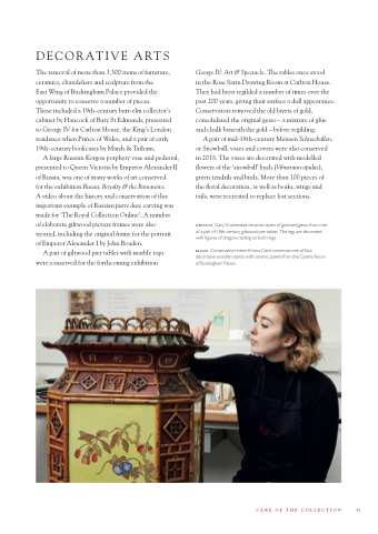 I T T E Gary Gronnestad removes layers of of of gold and gesso from one of of of of a a a a a a a a a a pair of of of of 18th-century giltwood pier tables The legs legs are decorated with gures of of of dragons resting on on bird’s legs B E E L O W Conservation Intern Emma Clare conserves one of four decorative wooden stands with ceramic panels from the
