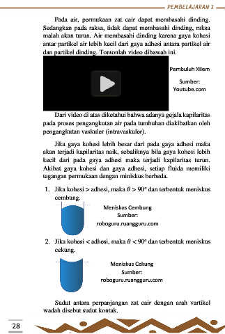 2. Jika kohesi < adhesi, maka < 90 dan terbentuk meniskus