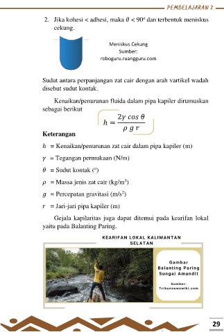 2. Jika kohesi < adhesi, maka < 90 dan terbentuk meniskus