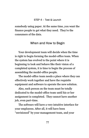Your development team will decide when the time is right to begin forming the model-office team. When the system has evolved to the point where it is beginning to look and behave like their vision of a completed system, it is time to begin the process of assembling the model-office people.