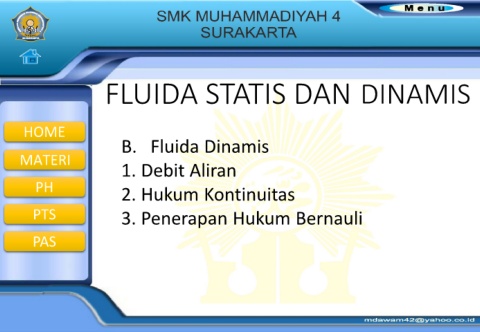 FLUIDA STATIS DAN DINAMIS HOME B. Fluida Dinamis MATERI 1. Debit Aliran PH 2. Hukum Kontinuitas PTS 3. Penerapan Hukum Bernauli PAS