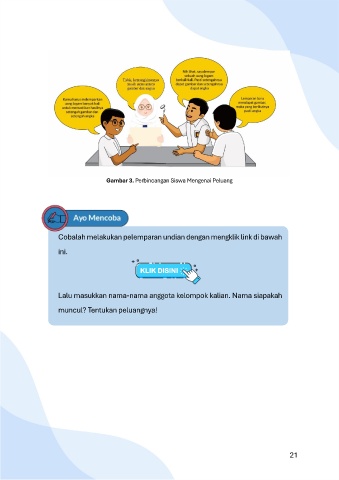 Gambar 3. Perbincangan Siswa Mengenai Peluang Cobalah melakukan pelemparan undian dengan mengklik link di bawah ini. Lalu masukkan nama-nama anggota kelompok kalian. Nama siapakah muncul? Tentukan peluangnya! 21