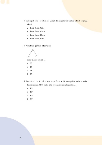 5. Jika ∠ = 2x – 4 , ∠ = x + 14 , ∠ = x + 10 merupakan sudut – sudut
