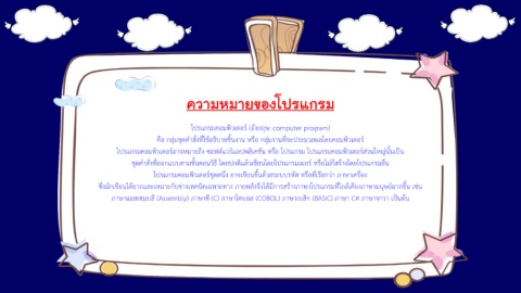 คือ กลุ่มชุดค าสั่งที่ใช้อธิบายชิ้นงาน หรือ กลุ่มงานที่จะประมวลผลโดยคอมพิวเตอร์
