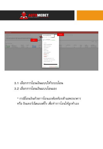 3.2 3.1 ื 3.1 เลอกการโอนเงินแบบให้ระบบโอน ื 3.2 เลอกการโอนเงินแบบโอนเอง ี ิ * กรณโอนเงนด้วยการโอนเองต้องต้องเข้าแอพธนาคาร ้ ู ิ ื หรอ อนเตอร์เนตแบงค์กง เพื่อท าการโอนให้ลกค้าเอง ็ ิ