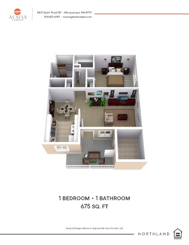 8401 Spain Road NE • Albuquerque, NM 87111 ACACIA 505.821.6957 • acaciagardensapts.com GARDENS 1 bedroom • 1 bathroom 675 sq. ft *Square footage listed is an approximate value for each unit.