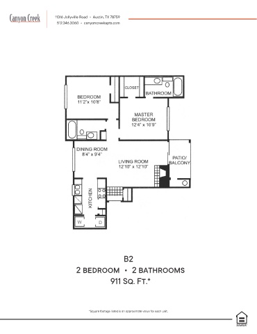 11316 Jollyville Road • Austin, TX 78759 512.346.3060 • canyoncreekapts.com B2 2 bedroom • 2 bathrooms 911 Sq. Ft.* *Square footage listed is an approximate value for each unit.